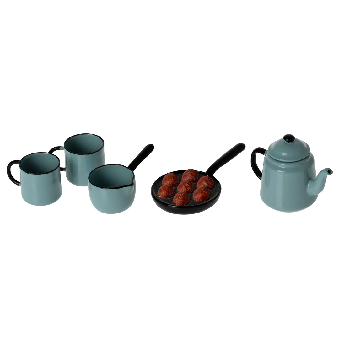A miniature cooking set with all Madam Blue`s favorites. A can and two cups, a saucepan and a pan with delicious puff cakes which is a traditional scandinavian treat in the winter time. All these parts come in a paper box that looks like a stove.