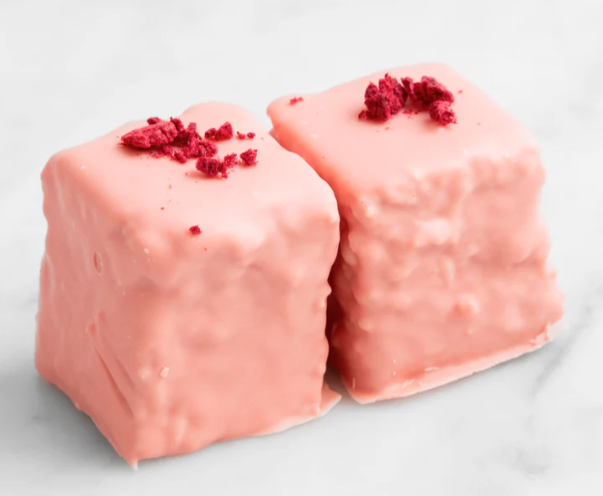 Buttery shortcake chunks stirred through velvety raspberry infused marshmallow, dipped in blushing 28% cacao couverture white chocolate.
